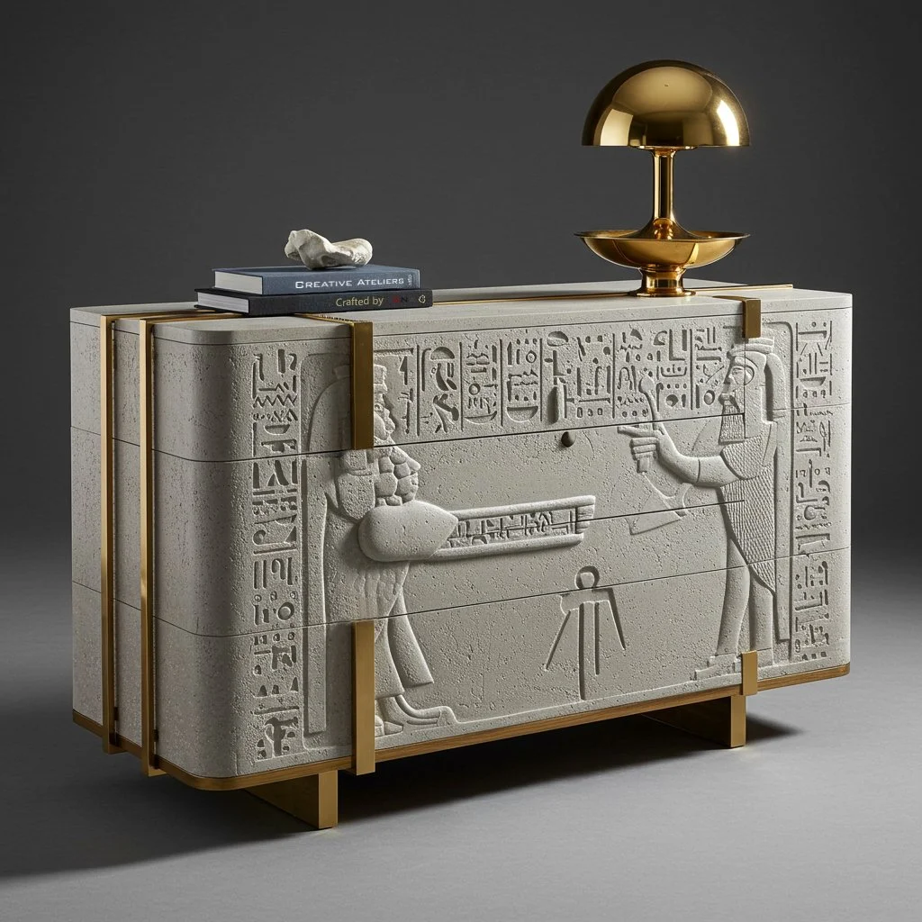 Placed in a living space, MENAT is more than a console — it is a centerpiece of cultural storytelling. Functional in its surface and storage, but transcendent in its presence, MENAT creates an atmosphere of elegance and serenity.